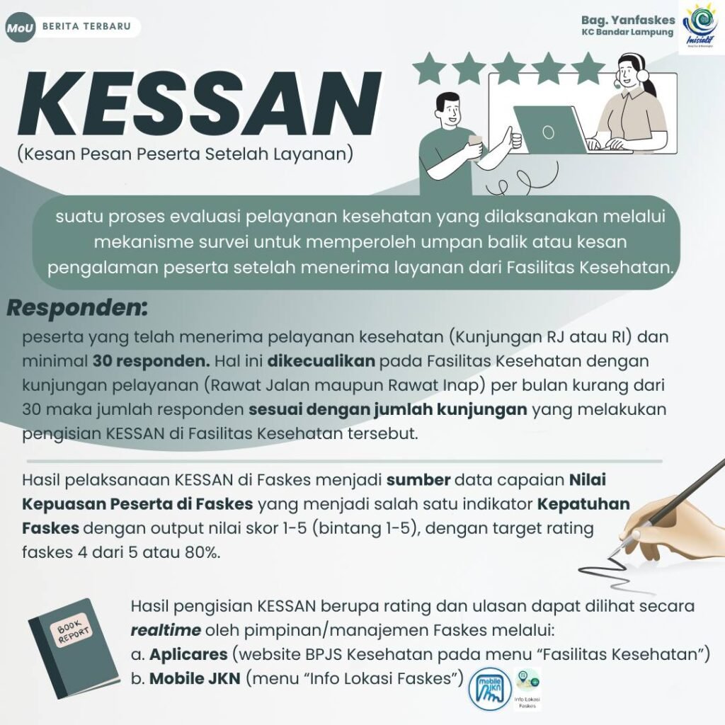 KESSAN ini masuk kedalam salah satu indikator kepatuhan loh Bapak/Ibu. Jadi jangan sampai lupa yaa untuk menyampaikan pengisian kessan kepada peserta yang telah mendapat pelayanan di fasilitas kesehatan🗣️